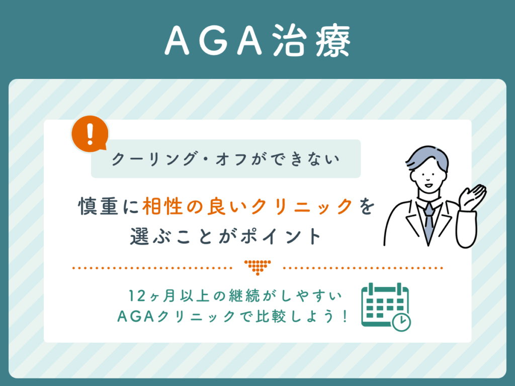 AGA治療は、特定商取引法の指定役務に該当せずクーリング・オフができないことから慎重に比較をしてしまい、あなたと相性の良いAGAクリニックはどこがいいか分からないと悩んでいる人も多いのではないでしょうか。